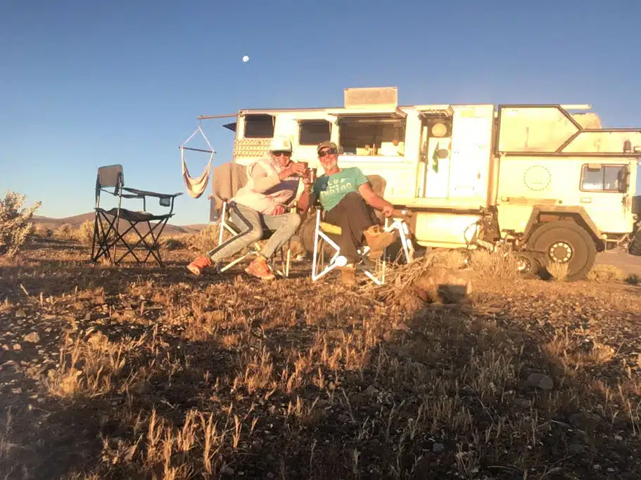 Thorsten und Gesa seit 1975, damals noch mit einem selbst ausgebauten Bulli, unterwegs. Nach der Rückkehr von einem 1,5-jährigen Aufenthalt in der Westsahara, bei dem sie damaliges „normales“ Fiat-Ducato/Chausson Wohnmobil “Camouflage“ geschrottet haben, hatten sie Gelegenheit der Abenteuer Allrad in Bad Kissingen einen MAN KAT 1- damals angeboten von einem holländischen Unternehmen – Probe zu fahren. Sogar Gesa war begeistert, über die „Einfachheit“ dieses 6 x 6 Monstrum zu bedienen. Inzwischen sind sie mit eben solchem Fatbaastard, einem 19 Tonnen, selbst ausgebauten, Monster-Expeditionsmobil unterwegs.