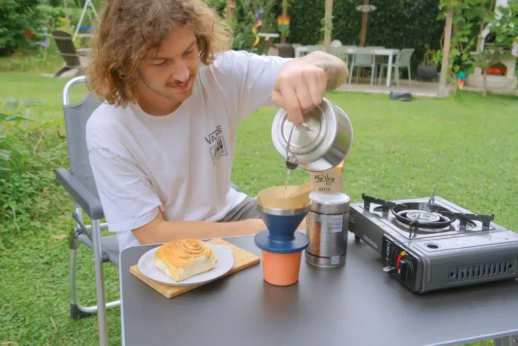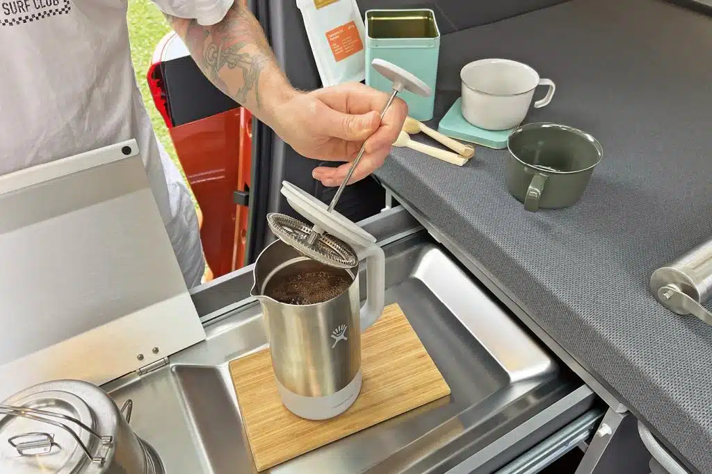 Filterkaffee ist nicht nur Omas Liebling, sondern schon längst Kult. Die Zubereitung mit Handfilter wird auch als Handaufguss oder Pour Over bezeichnet. Der bruchsichere Yeti Pour Over aus Edelstahl erweist sich beim Campen als praktisch, kostet 35 Euro und ist schnell verstaut. Für die Kaffeezubereitung im Camper werden zusätzlich Papierfilter und ein Wasserkessel, -kocher oder Topf benötigt. Klarer Vorteil: Der Filteraufsatz ist mit einem Wisch sauber und der Müll ganz einfach entsorgt. Das spart Wasser und die Kaffeepulversauerei in der Spüle bleibt aus – eine feine Sache.