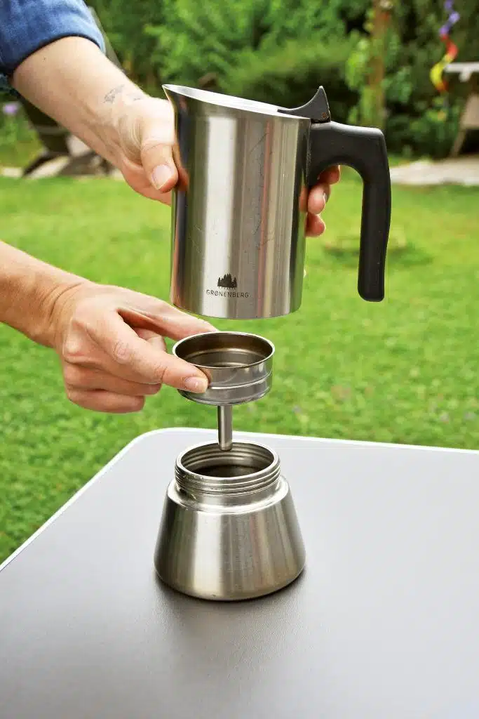 Der Espressokocher gilt als Klassiker, auch für den Kaffee im Camper. Oft wird umgangssprachlich die ikonische, achteckige Bialetti synonym verwendet. Der Espressokocher von Grønenberg aus Edelstahl ist für bis zu sechs Tassen und auch für Induktion geeignet. Das Nachfolge-Modell im frischen Design kostet 47 Euro und ist im Set mit einer Kaffeemühle erhältlich.