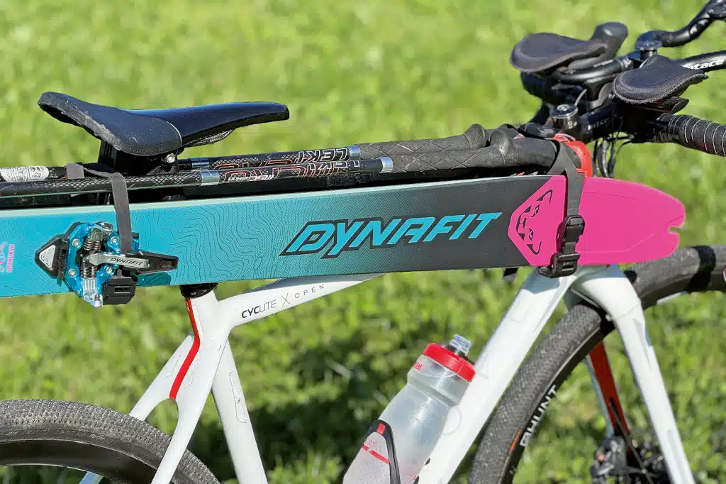 Die dritte Generation bedeutet: Das Produkt hat sich bewährt. Mit dem Bike auf Skitour – prinzipiell eine tolle Idee, wenn man nicht 200 Kilometer bis zum Berg radelt. Nicht ganz neu ist, mit dem Zug in Richtung Berge zu fahren. Wenn man dann noch das Fahrrad mitnehmen kann, ist die Kombi für Bahnhof bis Tourstart (und zurück!) ganz pfiffig. Ski und Stöcke werden an Oberrohr und Sattel befestigt und behindern beim Treten kaum.