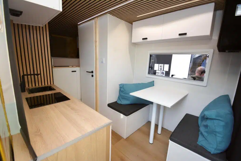 Auch eine 12-Volt-Klimaanlage baute Marcel Kurth selbst rein, da der Iveco keine besitzt und die kühle Luft über die Zwischentür auch das Fahrerhaus kühlt. Für Wärme und Warmwasser sorgt die Autoterm, eine Dieselheizung mit 2 kW. Alternativ kann das Wasser im Boiler auch elektrisch erhitzt werden. Damit das zum Duschen reicht, befindet sich unter der Sitzbank ein von außen befüllbarer 90-Liter-Frischwassertank. Die Sitzbank gehört zu einer Face-to-Face-Sitzgruppe, die auf der Fahrerseite ans Bad anschließt. Gegenüberliegend befindet sich die Küchenzeile und im Heck ein 160 mal 200 Zentimeter großes Querbett. Das ist extra hoch eingebaut, sodass Fahrräder und Kinderanhänger darunter passen – und ein paar Kisten Bier, die sind auch beim Selbstausbauercamp 2025 dabei. Zusätzlich zum Platz bringt der Postkoffer beim Selbstausbau zwei weitere Pluspunkte mit: die geraden und dank Verbundplatten vollisolierten Wände.