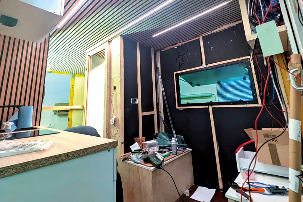 Die Decke zieren Akustikpaneele mit LED-Streifen. Tageslicht fällt durch ein Fenster des Herstellers Belluna über der Sitzgruppe ins Innere. Ein weiteres wurde im Bad eingebaut, auch zum Lüften. Als Boden der Nasszelle dient eine Edelstahl-Wanne, die ist mit dem Abfluss verlötet, und die Wände sind wasserdicht mit der Vinyl-Bodenplatte verklebt.
