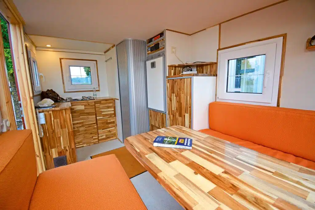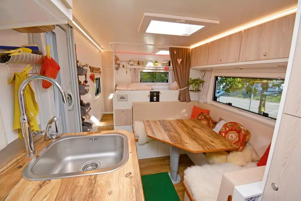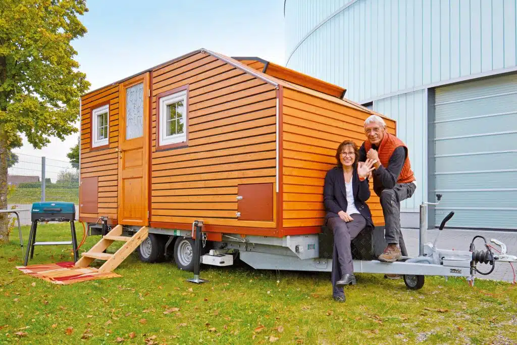 Der Tiny Trailor von Andreas und Yvonne Exner ist genau genommen kein Wohnwagen, sondern Ladung. Über 1,5 Jahre haben die beiden an dem Auf- und Ausbau des Eduard Tandem Cargohochladers gearbeitet. Der Grundriss von Tinyhäusern inspiriert mit offenem Raumkonzept, großer Sitzecke, Küche, abgetrenntem Bad und viel Stauraum: So gibt es auch einen ausziehbaren Schrank mit Kleiderstange. Das Material ihrer Wahl ist Holz – aus Liebe zur Natur, wie die beiden betonen. Für die Möbel im Innenraum wurden im Wesentlichen Akazie und Ahorn verwendet. Für viel Licht haben sie in der Schräge ein Panoramafenster eingebaut.