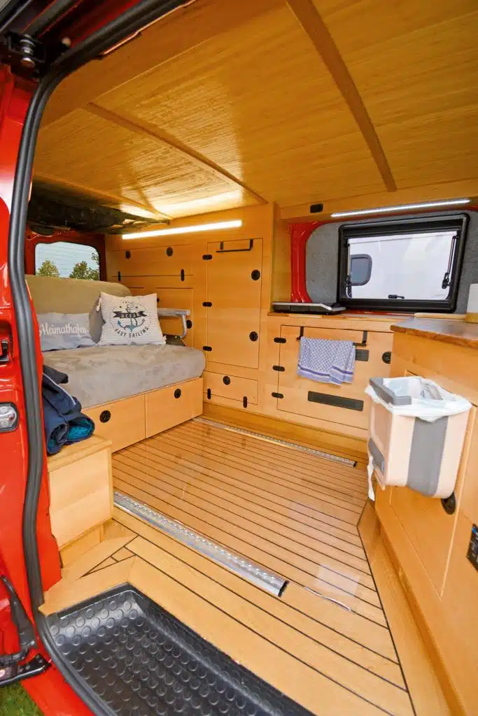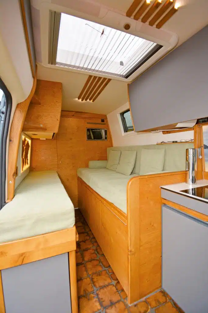 Der gelernte Bootsbauer Hans Werner Großkopf ist ein Nordlicht aus Lübeck. Mit dem Ausbau seines Ford Transit Custom begann er im Frühjahr 2024 – der Grundriss ist ein eigener Entwurf. Die Holzdecke mit ihren Verstrebungen fällt als erstes ins Auge, ebenfalls aus Vollmaterial gefertigt sind die Möbel. Eine kleine Lüftungsluke verbindet das Fahrerhaus. Um Material zu sparen, wurde die Möbelfront aus einer Holzplatte gefertigt – das Spaltmaß schmal und sauber gearbeitet. Meist ist Hans Werner Großkopf zu zweit und mit kleinem Hund an Bord unterwegs, am liebsten im heimischen Deutschland.