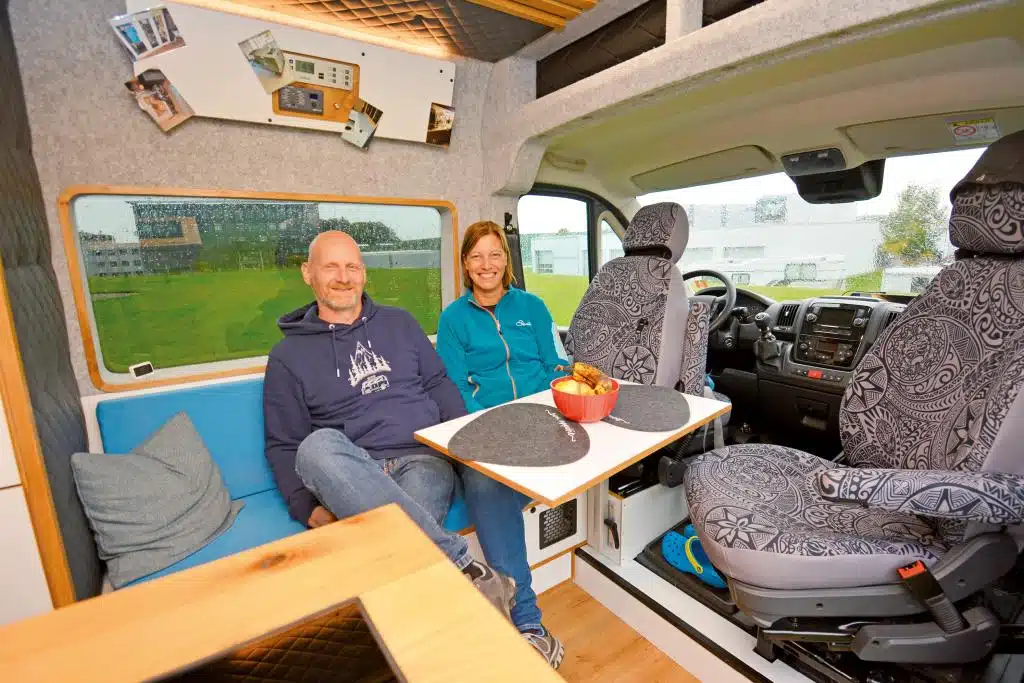 Ein Bullauge im Heckbad, das Bett höhenverstellbar mit einer Mini-Wasserwaage, die beim Ausrichten hilft, der Boden aus fünf Millimeter dünnen Scheiben aus Eichenholz: Der ausgebaute Fiat-Ducato-Kastenwagen von Josef und Kathleen Braunmiller wirkt elegant und minimalistisch. Die Möbel aus massiven Holz, die Blenden aus HPL, im Bad ein selbst geformter Hängeschrank aus Epoxidharz und im Wohnraum zieren geschwungene Kanten aus Plexiglas die Regale – ein stimmiges Gesamtbild unterschiedlichsten Materials.