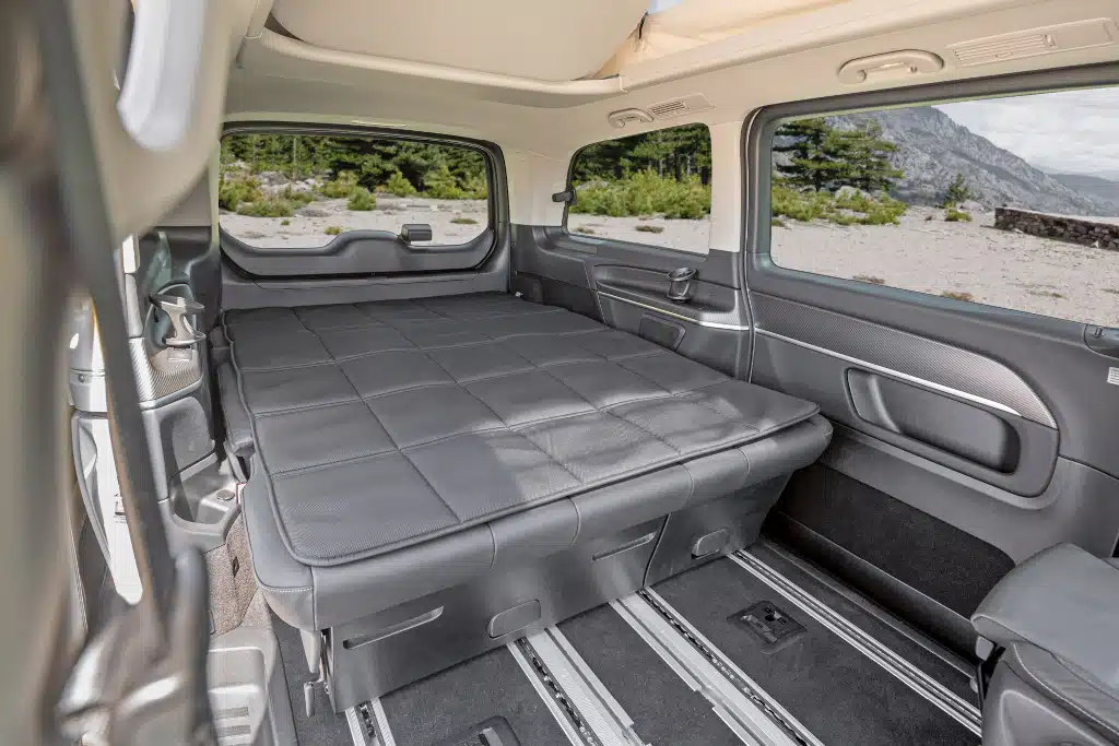 Der neue Beach setzt auf die Einzelsitze des Multivan, die sich ein Mü besser sitzen und mit schlanken 27 Kilogramm viel einfacher ausbauen lassen als die Dreierbank des Horizon – wobei für die meisten Transportaufgaben jeweils der ordentliche Verschiebeweg genügt. Trotz geringerer Außen- hat die V-Klasse 20 Zentimeter mehr Innenraumlänge (265 Zentimeter). Das wird besonders deutlich, wenn die Fahrzeuge mit dritter Sitzreihe geordert werden. Ab Werk sind Horizon und Beach mit fünf gurtgesicherten Sitzplätzen ausgestattet, unser Beach ist als Viersitzer konfiguriert (minus 292 Euro). Im Horizon ginge das im Prinzip auch, doch dann entfällt die Schlaffunktion.