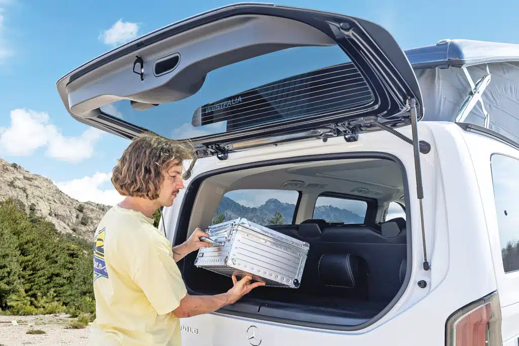 VW geht deutlich weiter in Richtung Camping und spendiert dem Beach auf Wunsch auch eine Miniküche. Diese ist seit dem Modellwechsel nicht mehr in der Seitenwand der Karosserie integriert, sondern in einer größeren Technikbox im Heck untergebracht. Sie belegt ziemlich genau die Hälfte des Kofferraums und schlägt mit 1.428 Euro zu Buche. Dafür erhält man einen einflammigen Gaskocher mit Piezo-Zündung und Windfang, auf dem ganz ordentlich gekocht werden kann, sowie eine Aufbaubatterie und eine 230-Volt-Steckdose. Auch lassen sich ein paar Vorräte und etwas Kochgeschirr unterbringen. Die bereits erwähnten Campingmöbel bringt der Hersteller sauber in der Verkleidung der Heckklappe und unter der Bettenverlängerung unter.