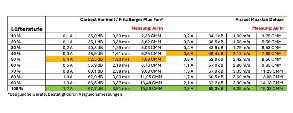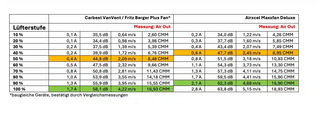 Schon 2020 zeigte sich: Große Luftmengen bewegen können alle Ventilationsdachhauben mehr oder weniger überzeugend. Das gilt auch für den aktuellen Vergleich der Maxxfan mit der Carbest VanVent und der Fritz Berger Plus Fan. Da die Leistung der Lüfterstufen von Ventilationsdachhauben immer im direkten Zusammenhang mit dem Stromverbrauch und der Lautstärke betrachtet werden muss, um eine sinnvolle Vergleichbarkeit herzustellen, haben wir Ihnen diese Ergebnisse in zwei Tabellen übersichtlich dargestellt.
