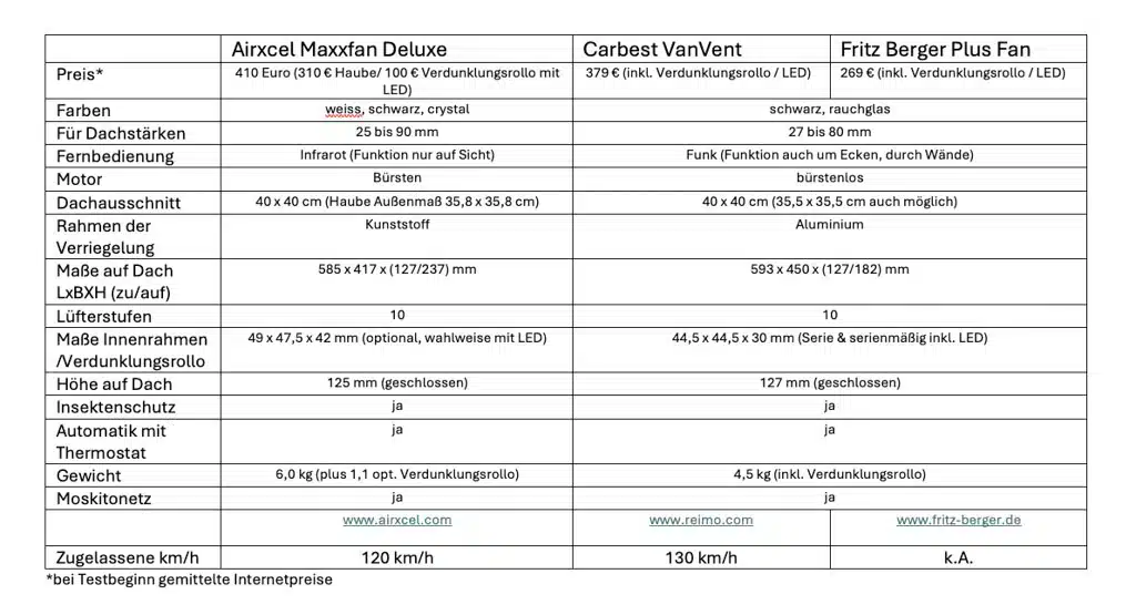 Die Unterschiede, die die baugleichen Carbest VanVent und die  Fritz Berger Plus Fan von der Airxcel Maxxfan trennen sind nicht nur auf dem Papier enorm. Gewicht, Preis und Funktionalität der Fernbedienung sind enorm.