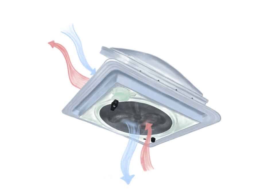 Keine Frage: Einer Kompressorklimaanlage können Vent-Dachhauben nicht das Wasser reichen. Diese kühlen die Innenraumlauf effektiv herunter und entfeuchten sie parallel. Wertvolle Schritte in Richtung Wohlfühlklima. Aber: Kompressorklimaanlagen sind Stromfresser. Sie benötigen 230 Volt, im Idealfall also Landstrom oder leistungsfähige Wechselrichter und gewaltige Batteriereserven – schon für vergleichsweise kurze Betriebszeiten. Und: Nicht Camper ist ein Freund von Kaltluft aus Klimaanlagen. Eine Abkühlung erzielen Ventilationsdachhauben maximal auf das Niveau der Außenluft. Sie saugen die sticke Luft aus dem Fahrzeug – oder schieben, alternativ, die Frischluft hinein – je nach Drehrichtung des Ventilators. Am Ende ist der Effekt ähnlich – es findet ein Luftaustausch mit der Außenluft statt. Je nachdem, ob über der Haube, oder vor dem jeweilig geöffneten Fenster die Luft kühler ist, lohnt es sich über die Drehrichtung des Ventilators entsprechend anzupassen.
